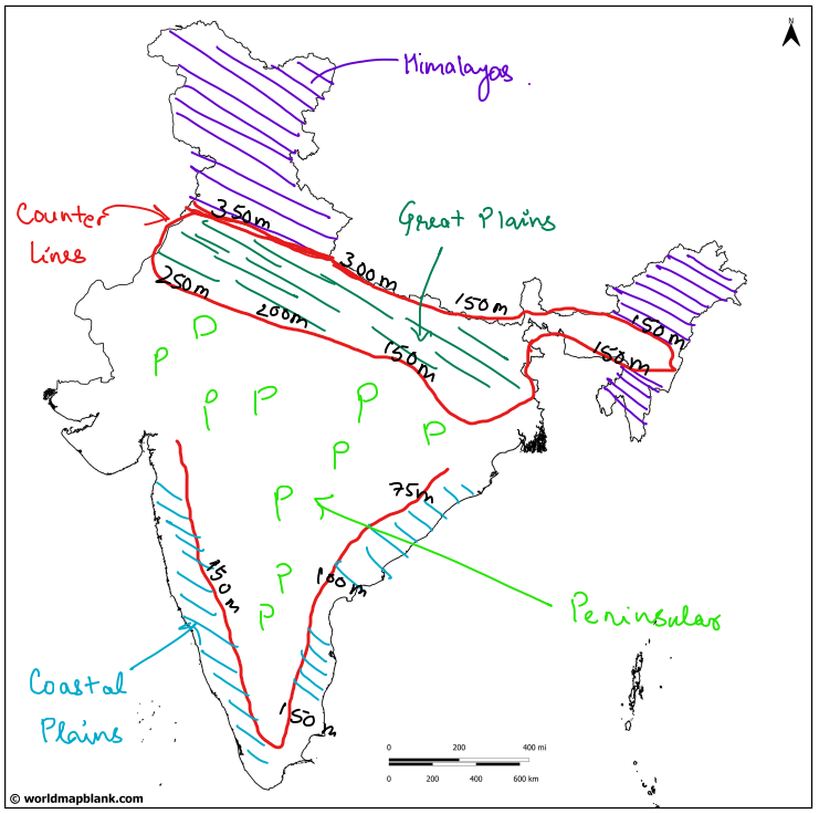 Survey of India has given: physiographies counter lines (as shown in the map below) altitude above the mean sea level